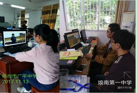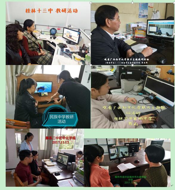 本次联片主题教研活动除了老师们现场参与观课、听取讲座、主题研修之外,还有一个创新之处,就是采用了“互联网+教研”的思维方法去组织实施,活动全程由桂林市教育电视台提供技术支撑,采用全区同步网络直播的方式,辐射全广西,让更多的未能到现场参会的化学老师,都可以同步观看现场直播,同时获得培训学习的机会,促进了优质资源的共享。这在广西教研院组织的学科教研活动中尚属首次,得到了一线老师们的普遍认可。各市老师,特别是乡镇级初中老师纷纷上传自己用电脑或者手机通过网络学习的照片,以表达自己参与活动的热情,及对这种教研活动形式的认同和赞许。