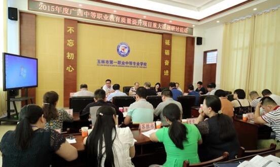 为了更好地推进广西教育科学“十二五”规划2015年度广西中等职业教育质量提升项目重大课题研究工作, 2018年5月11日在玉林市第一职业中等专业学校召开课题总结研讨会,广西教研院副院长韦海韬、兰瑛副研究员、广西工业技师学院书记曾繁京,以及来自广西中等职业教育10余所项目学校的领导、教师近三十余人参会。