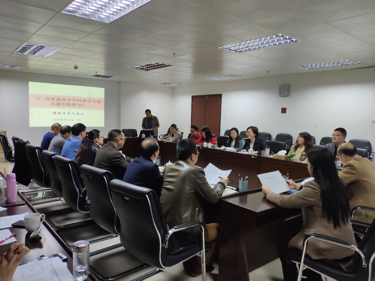 2019年3月15日下午,广西教育研究院在南宁召开了《广西普通高中学科教学关键问题实践研究》专项课题负责人会议。来自南宁市第三中学、南宁市第二中学、柳州高级中学、柳州铁一中学、广西师范大学附属外国语学校的30多名老师齐聚一堂,共探学科教学关键问题的外延内涵及解决策略,共商课题研究具体步骤,研讨在教学实践中落实学科核心素养的方法路径。