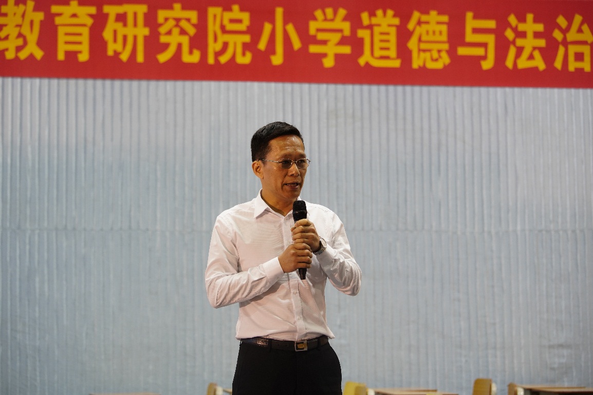本次活动还特邀了国家基础教育课程专家工作委员会委员、部编版教材核心成员、武汉市武昌区大东门小学孙民校长作《道德与法治教育解析》专题报告。他认为,在核心素养背景下,中小学进行道德与法治教育必须坚持德法并举、坚持生活德育,即坚持法治教育与道德教育相结合,注重以法治精神和法律规范弘扬社会主义核心价值观,以良法善治传导正确的价值导向,以儿童的生活为基础,在课堂教学中潜移默化的传播法的理念、精神与价值,让学生理解法治的道德底蕴,牢固树立规则意识、诚信观念,尊崇公序良俗,实现法治育人功能。