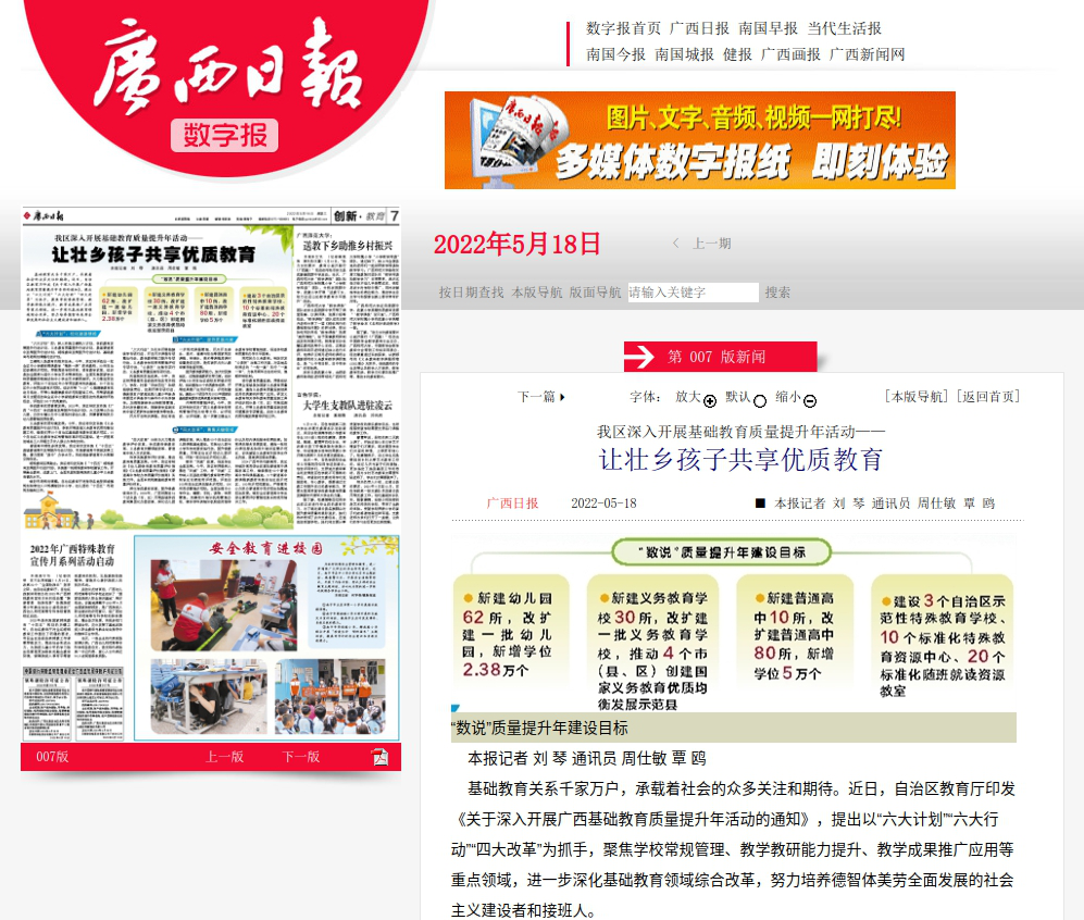 基础教育关系千家万户,承载着社会的众多关注和期待。近日,自治区教育厅印发《关于深入开展广西基础教育质量提升年活动的通知》,提出以“六大计划”“六大行动”“四大改革”为抓手,聚焦学校常规管理、教学教研能力提升、教学成果推广应用等重点领域,进一步深化基础教育领域综合改革,努力培养德智体美劳全面发展的社会主义建设者和接班人。