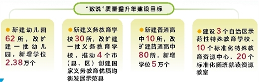 义务教育优质均衡发展。今年,我区将印发实施《义务教育质量提升行动计划》,积极开展县域义务教育优质均衡创建工作,继续支持10个自治区基础教育教学改革示范区、10个自治区义务教育学区制管理改革示范区建设。进一步提高进城务工人员随迁子女入读公办学校比例。