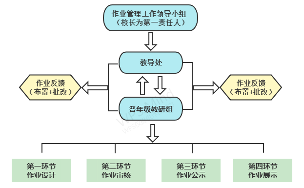 学校成立作业管理工作领导小组,形成由校长主管统筹协调、教导处主抓督促落实、教研组具体实施的三级实施网络,具体操作采取教导处和教研组双线并行、教研组互鉴互赏和教导处检查展示叠加的模式。学校还加强作业与单元备课和上课、作业批改和反馈等的教研力度。规定凡是给学生布置的作业,老师必须先做,在试做的过程中了解作业的难易程度、完成所需时间、易错点等,杜绝随意布置作业的行为,从而控制作业总量、把控作业内容、严格作业要求,切实提高作业质量。