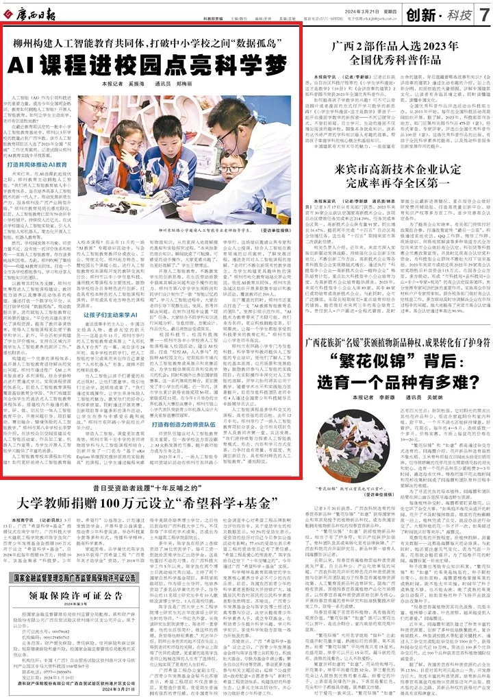 在最近教育部认定的一批中小学人工智能教育基地中,柳州以3所学校的数量占到广西半数。该市人工智能教育项目还入选了2023年全国“双减”工作优秀案例。记者试图从柳州的AI教育实践中寻找答案。