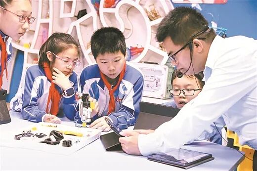 构建起一个完善的课程体系,是开展人工智能教育亟待解决的突出问题。柳州市通过推广《AI上未来智造者》系列课程,结合学龄特点进行贯通式学习,实现课程资源的体系化,目前人工智能教育课程覆盖基础教育全学段。“我们构建面向全体学生的递进式人工智能教育课程体系,搭建校内外融通的教、学、研、做、创五位一体人工智能教育平台,开展问题引导、项目驱动、赛创融合、情境体验的人工智能教学。”柳州市第八中学校长李梦玲介绍,在该校众创空间里建设有人工智能活动室、作品加工室、机器人工作室等,为学生开展人工智能学习提供了丰富的场景。