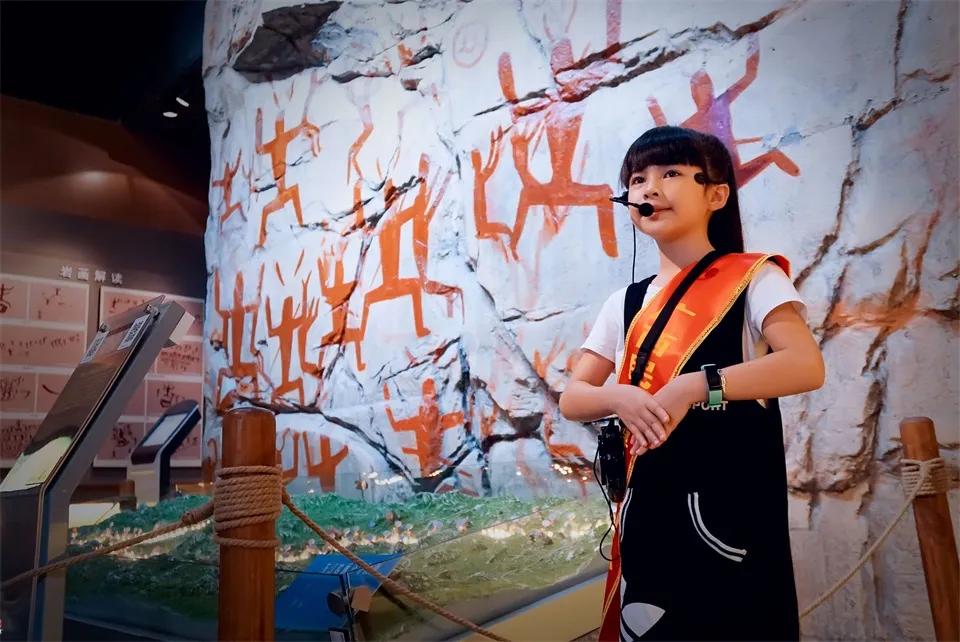 ▲当地学生参与广西民族博物馆志愿者服务活动,为观众讲解左江花山岩画。 广西民族博物馆供图
