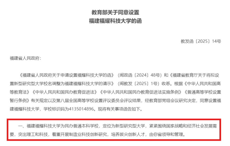 如,本次批准设立的福建福耀科技大学,教育部的批复《函件》中明确其定位是新型研究型大学。要求其紧紧围绕国家战略和经济社会发展需要,突出理工和科技。此外,教育部于2024年5月批准设立的深圳理工大学(理工类)和康复大学(医药类)均定位为高水平新型研究型大学。